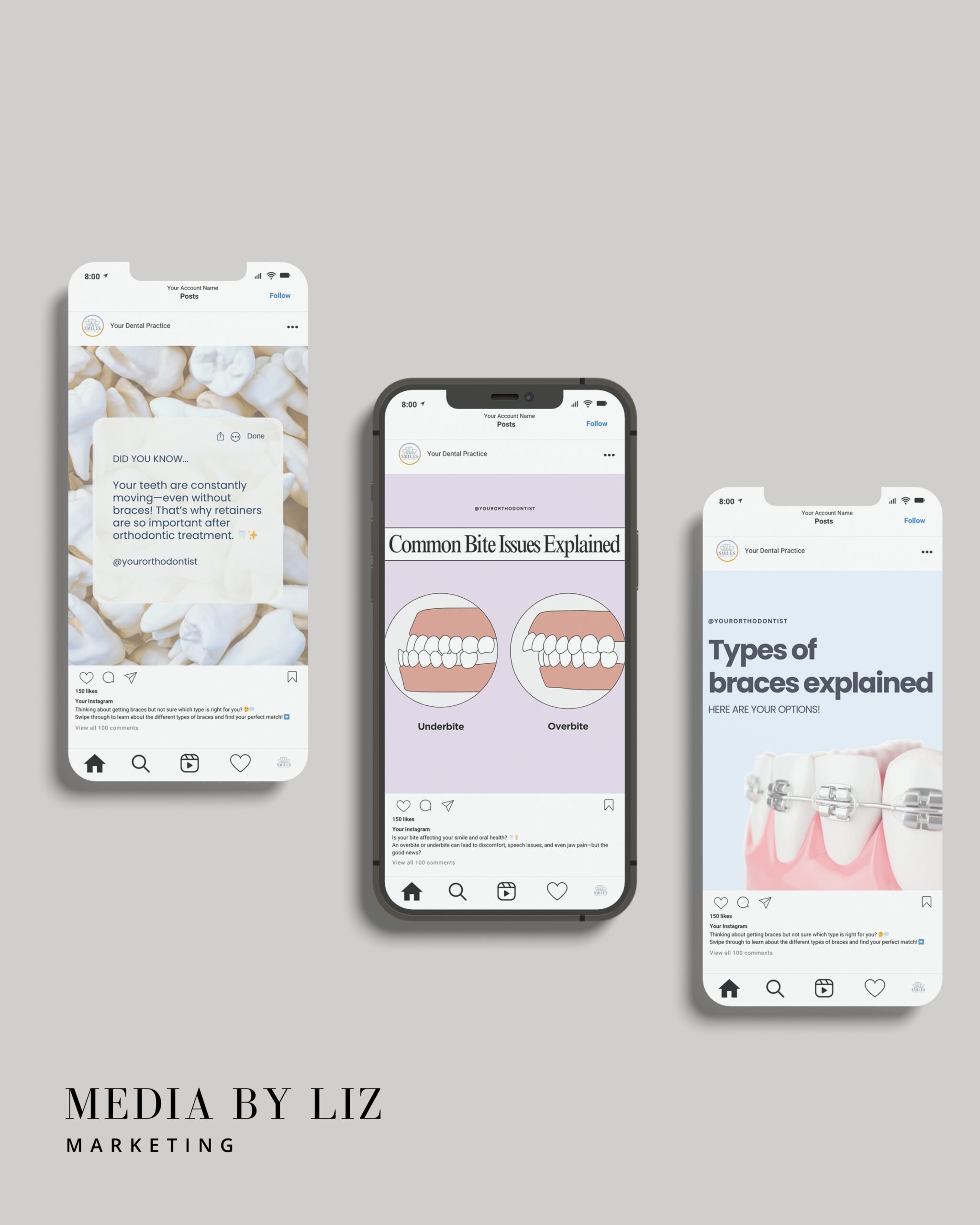 Orthodontist Instagram content ideas Canva template pack by Media by Liz for dental clinics promoting braces and smile makeovers